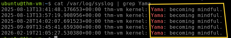 we will use the command cat /var/log/syslog | grep Yama