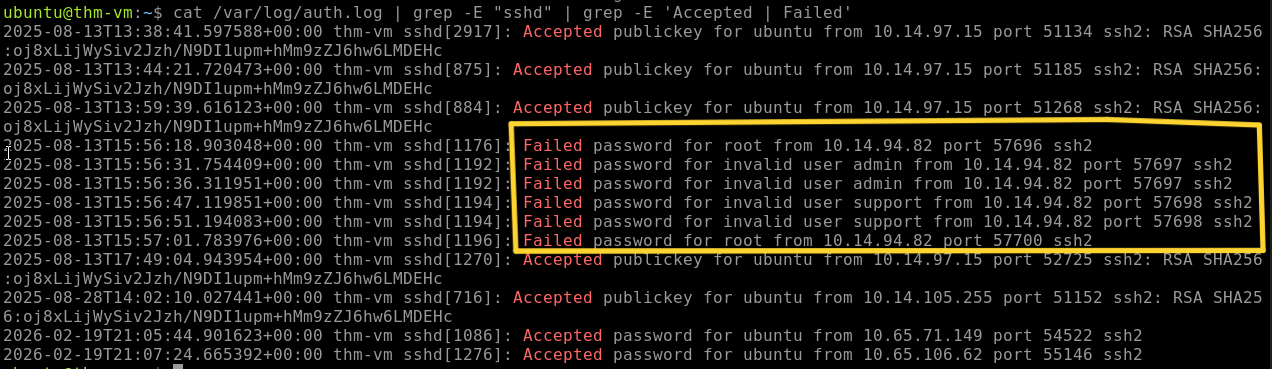 we will use the command cat /var/log/auth.log | grep -E "sshd" | grep -E 'Accepted | Failed'