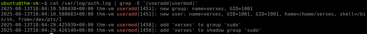 At 18:04:10, a new user was created with name xerxes and added to the ‘Sudo’ group at 18:04:29.