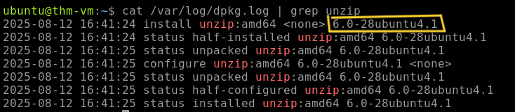 we will use the command cat /var/log/dpkg.log | grep unzip