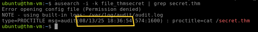 Using the note given, we will use the command ausearch -i -k file_thmsecret | grep secret.thm