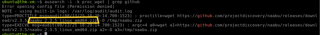 Also using the note, we will use the command ausearch -i -k proc_wget | grep github